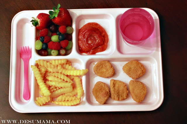 Once the chicken was done, I mixed one part ketchup and one part vegetable puree and plated Alina’s dinner with some fresh fruit and a cup of water. Just like I expected, she wasted no time in dipping her food in the vegetable ketchup. I have to admit, I held my breath anxiously, waiting for her reaction. She loved it. Vegetable Ketchup is a keeper!