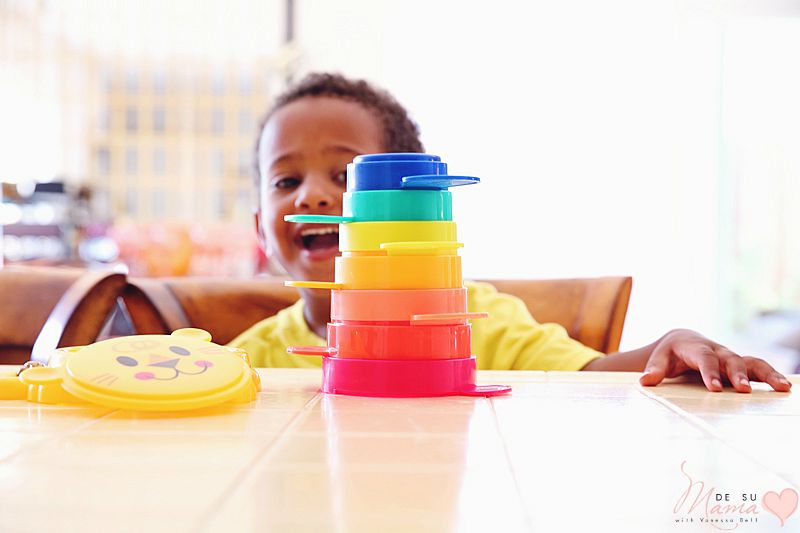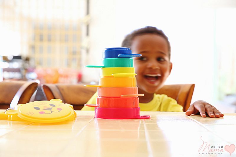 But our favorite place to play with this toy is at the kitchen counter as I’m cooking dinner. He gets to be close to me, like he loves, but not under foot – all while still being focused on a task: stacking his cups!