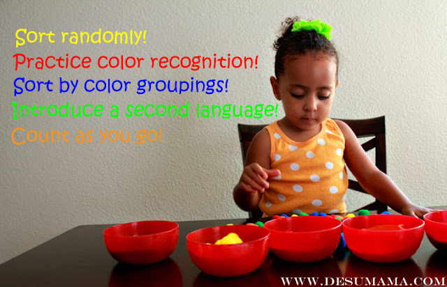 We then sorted with a focus on naming each color {we made up a song to names of the colors, since Alina loves music} and we also practiced our Spanish. Changing the focus made it seem like the activity was a new game, although we continued to work on color sorting skills.