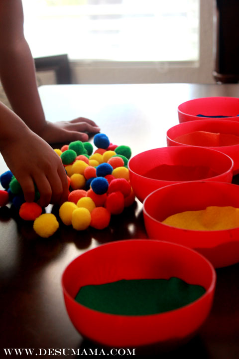 We had five of the same, small red bowls. We traced the bowls and cut out circles on five pieces of felt. I bought a pack of these multicolored felt pom pom balls in Target’s $1 section awhile back. After placing a felt circle at the bottom of each bowl, I showed Alina how, although appearing to be the same, each bowl matched up with a different colored pom pom. She got the idea very quick. Without much more instruction, and within 2-3 minutes, she had all 100 pom poms sorted into their appropriate bowls…