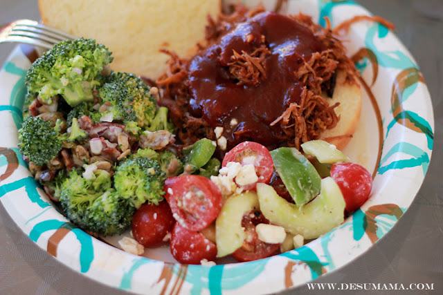 We had one heck of a spread at our July 4th BBQ, including a ton of different party food ideas! My Sister whipped out some ribs and other goodies, Grammy made her amazing broccoli salad and I brought my version of Greek salad and fruit. I also made pulled pork in the crock-pot for the buttery King’s Hawaiian rolls. We had way too much food!