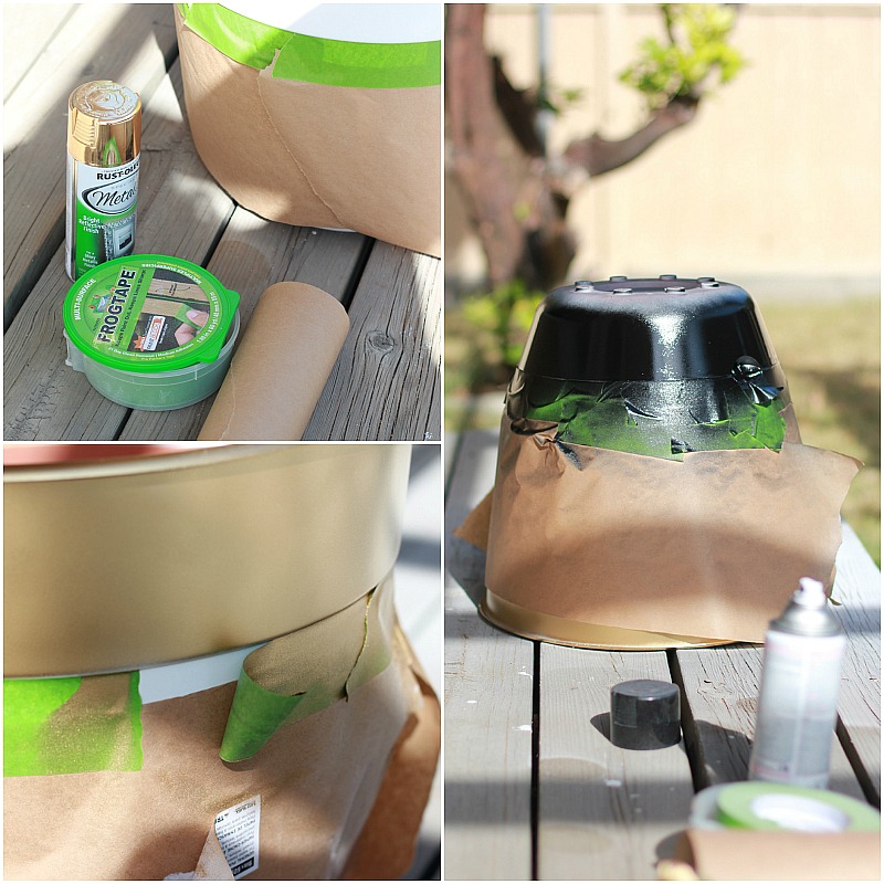 For this project, I used a metallic gold spray paint, as well as a high gloss black and white spray paint. To create the crisp lines, though, you should try Painter’s Frog Tape. It’s made for multi-surfaces and was gentle on the new paint I applied it on. Definitely a must-have on your list for DIY projects!