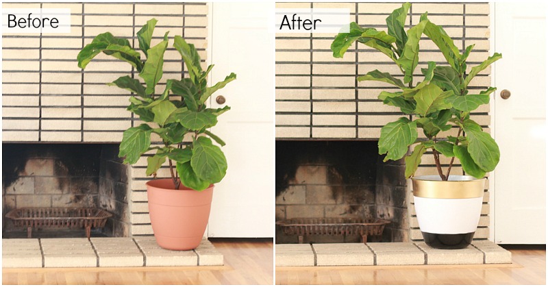 Creating this Mid Century Modern inspired planter was super easy and affordable. After spray painting the entire planter with one layer of white, I simply taped each section off, applying construction paper to keep the clean lines, and spray painted the top and bottom layers. I added a second white coat in the middle for good measure.