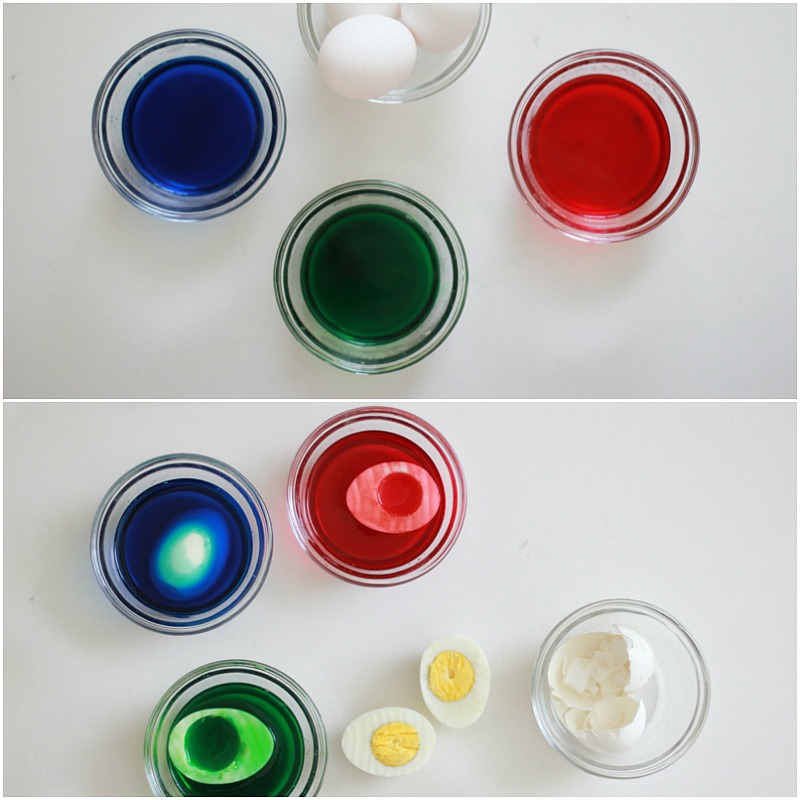 Boil the eggs and allow to cool completely. While your eggs are boiling, prepare the dye by mixing a bit of food dye with water; avoid vinegar unless you want the flavor in your sammie. I used red, blue and green food dye. Yellow was already mixed in with the yolk! Once they’re cool to the touch, half the hard boiled eggs lengthwise and remove yolk, setting it inside a mixing bowl. Take each half and immerse in prepared food dye. Let the egg sit in the dye bath for 3-5 minutes, rotating them as needed. Remove and rinse, before chopping and adding the dyed egg to the mixing bowl.