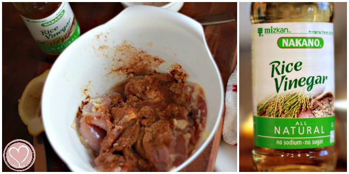 Combine garlic, olive oil, cumin, ginger, salt, turmeric, cinnamon and pepper in a large bowl with the lemon and rice vinegar. Add chicken pieces and coat evenly with the spice mixture. Cover and refrigerate chicken for 1 hour at least. Fire up the grill (or, if like me, have the hubby fire up the grill) and cook through.