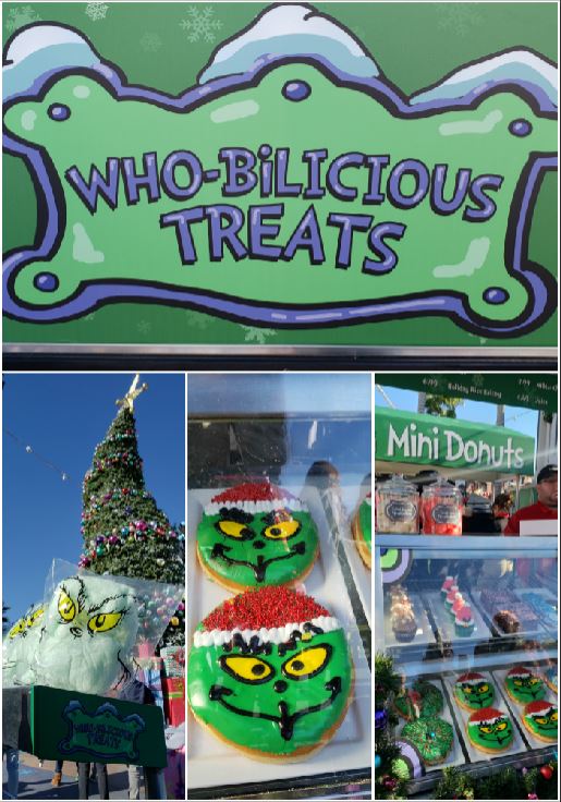 My kids LOVED the performances, but my favorite was probably the fun Christmas treats at Who-ville! Some of the food we enjoyed at Grinchmas could be found at the Who-bilicious Treats cart right next to the line to see the Grinch. Treats included green cotton candy, holiday rice Krispy treats and cookies, hot chocolate cupcake, the Grinch cupcake and of course the famed Grinch donut.