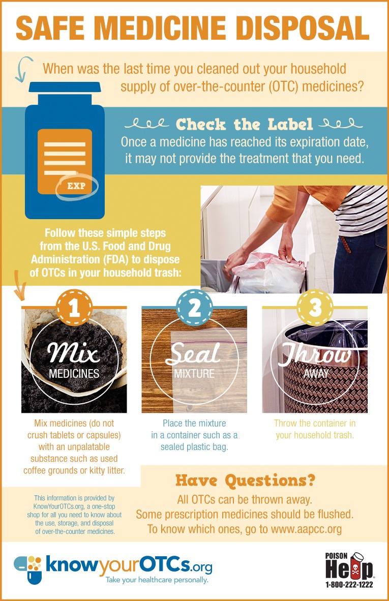 The good news is that in-home medicine disposal of all OTCs is safe and convenient. The question of where to dispose of medications is super easy, too. Just follow these three simple steps from the U.S. Food and Drug Administration (FDA):