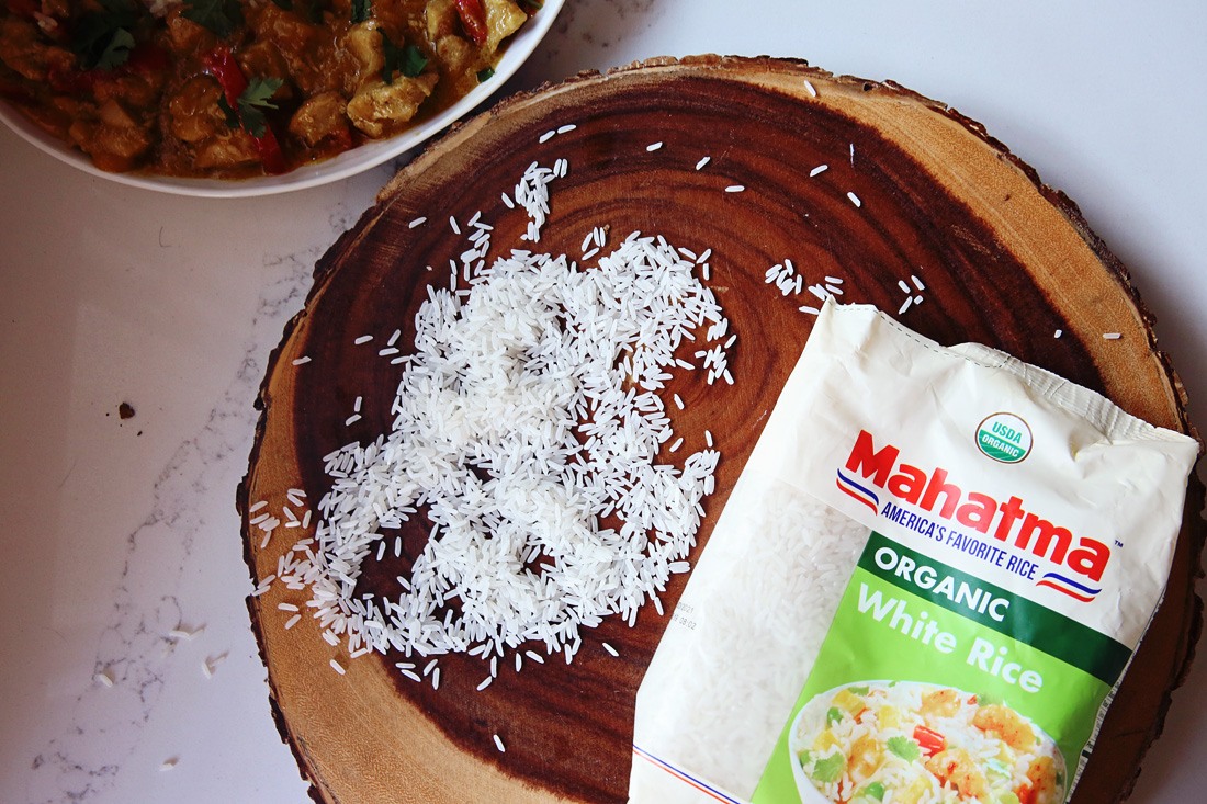 This delicious mango curry served with organic rice will quickly make your weeknight dinner rotation. Mango chicken curry, made with smoky spices and decadent coconut milk, is an easy curry recipe the whole family will love.
