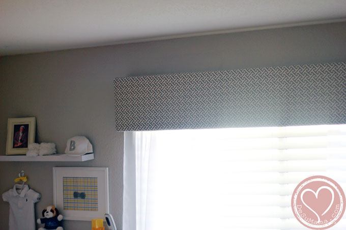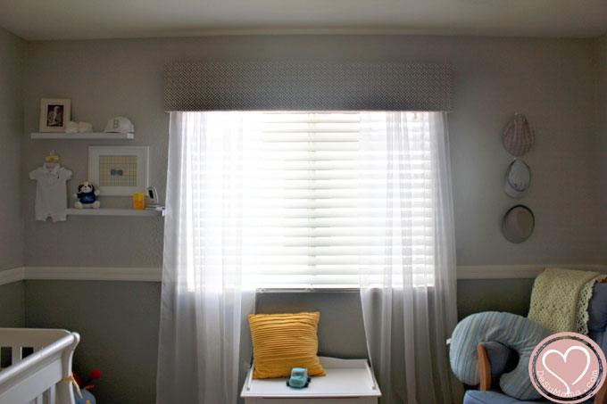 There are so many DIY gems in this room. It was a family effort painting and installing the chair rail. The paper owl mobile and name banner were made by my sister for my baby shower. She also made Sebastian’s beautiful quilt. My stepmom made his custom crib skirt and gifted him the sweet, crochet blanket that drapes the rocking chair. He came home from the hospital wrapped in its love. I made the bow tie adorned “S” hanging above his crib, painted the dresser knobs and customized the lampshade with a bit of ribbon. But the DIY feature I am most proud of is his boxed valance. I made that! It was surprisingly easy (hanging it up was by far the hardest part) but gives his window the crisp, modern touch that I wanted. I love it!