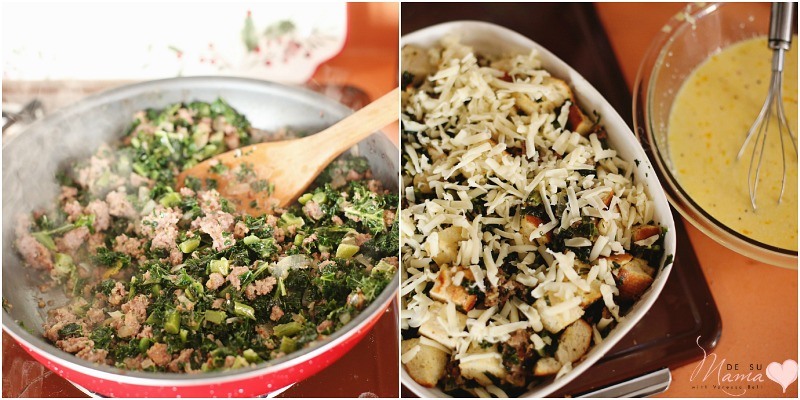 Drizzle the egg mixture throughout the bread and sausage mixture evenly. Now set the dish aside for at least 30 minutes, but overnight works too, giving the bread time to soak up all the yummy flavors of the sausage and kale.
