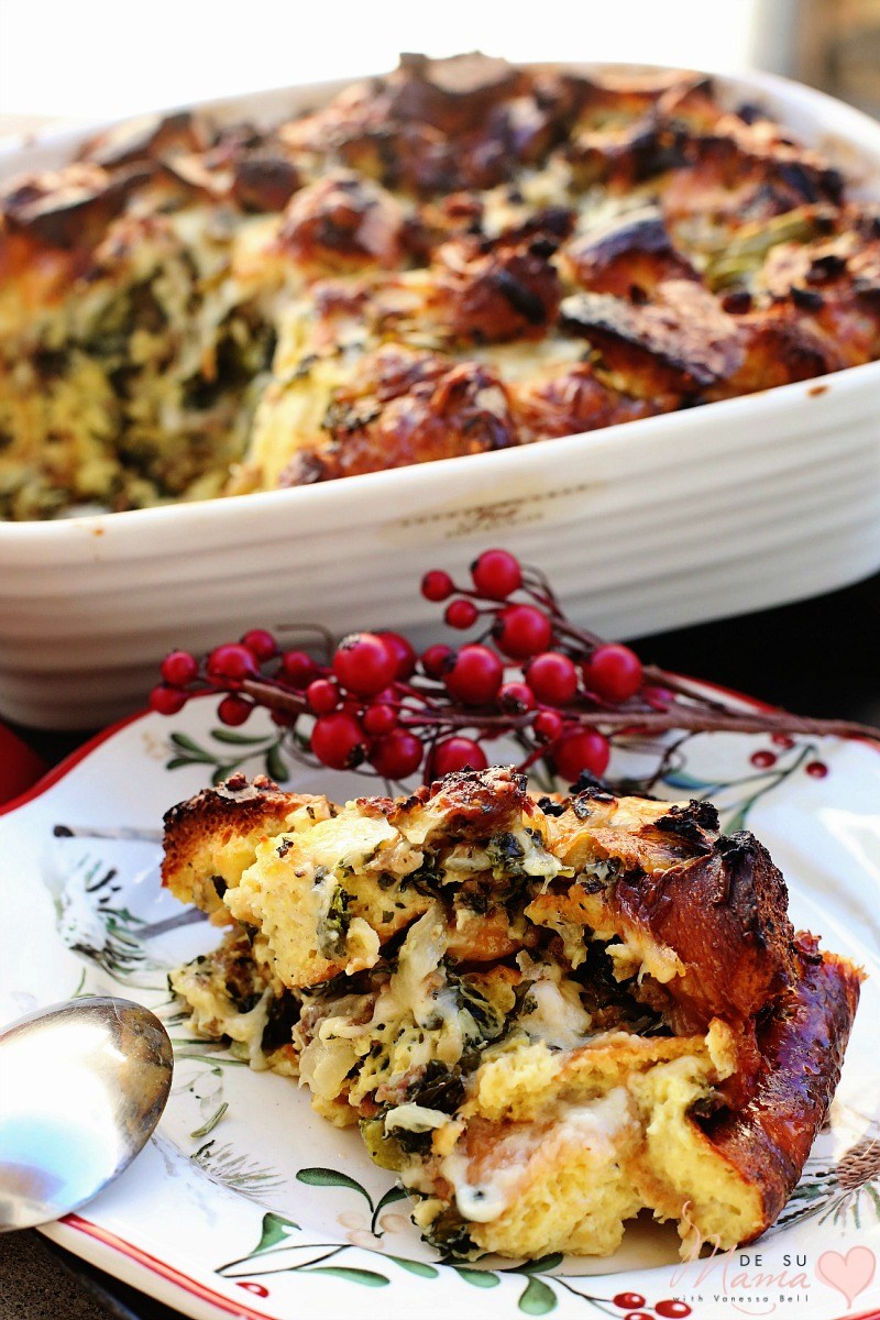 The only thing that could take our holiday from good to great is the arrival of our family on Christmas day. In previous years, I hosted Noche Buena (Christmas Eve) because we lived in another state from our Cuban family. Now that things are reversed and we can attend Noche Buena at my grandmother’s, I will be hosting Christmas Brunch for the very first time. I’m super excited and have been working on our menu for weeks – including this make-ahead, Savory Bread Pudding with Kale and Sausage.