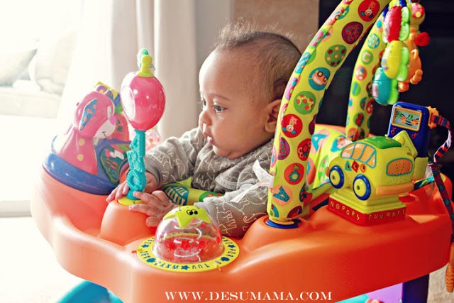 As an older 4 month old baby, we put our little guy in an exercauser with some added support. He didn’t need the support for long though, because by the time he was nearing 6 months old, he was playing like crazy! At first, he played quietly. He would use his feet to twist the seat and move from each station to play with all the various toys. It’s so fun to watch him learn.