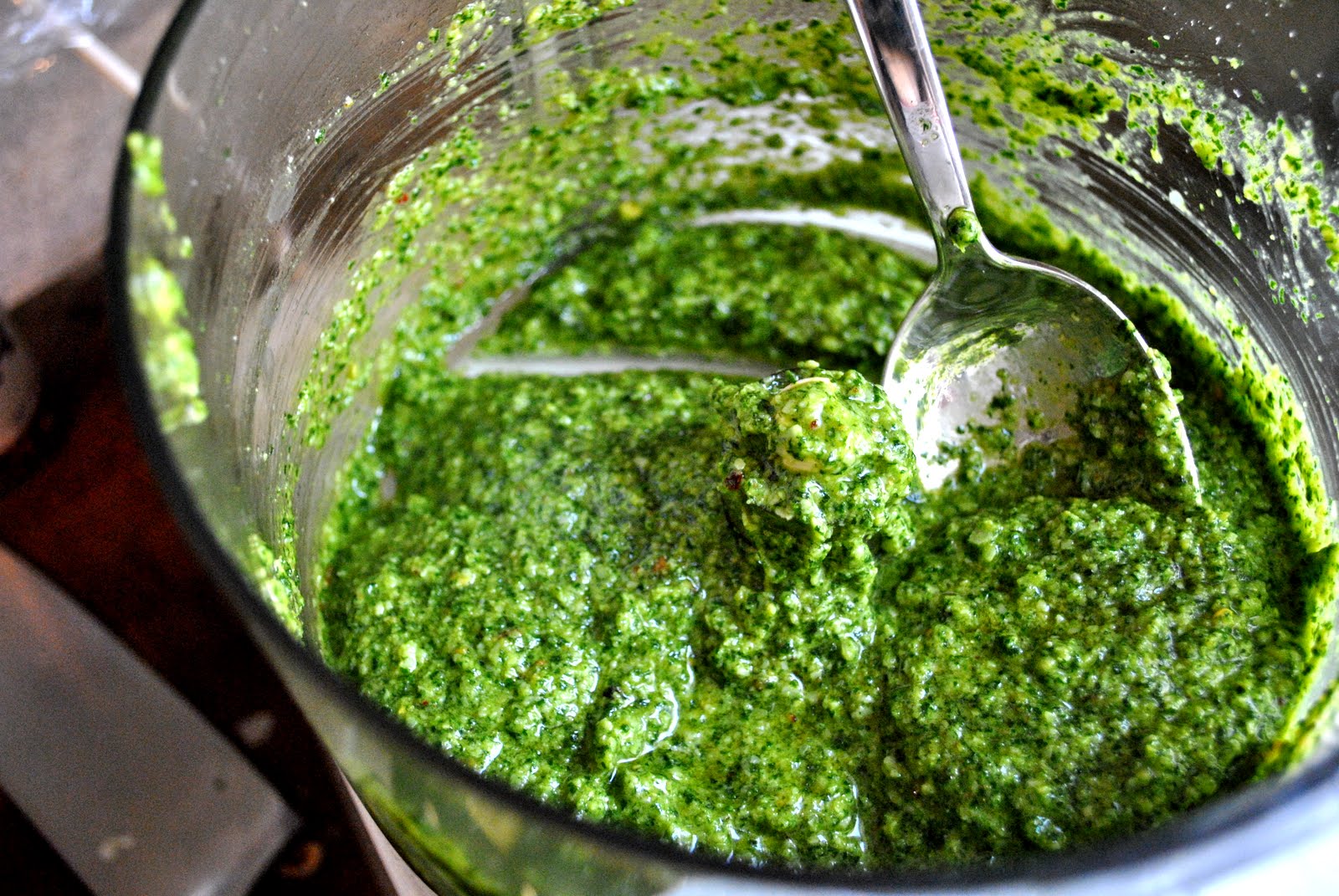 And you’re done! Store the pesto in an air tight container and refrigerate for a day to maximize the flavors. Seriously, I can eat this stuff straight from the processor!
