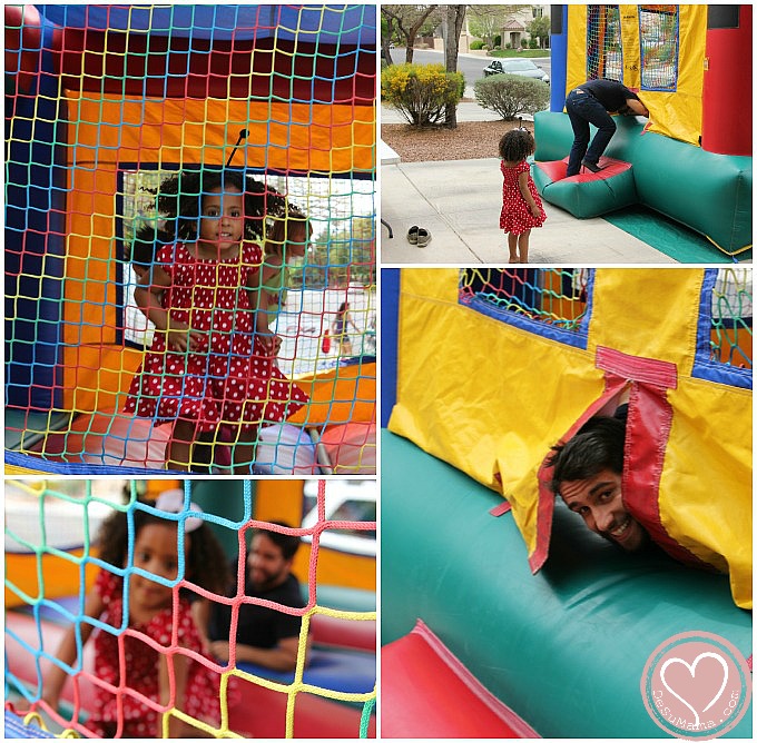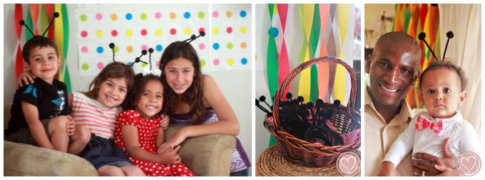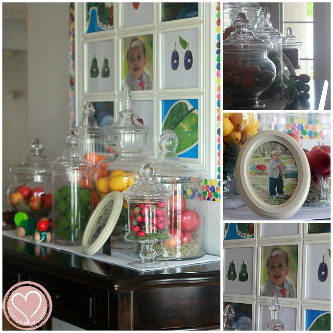 We ordered a bounce house for the kids (and Tio) and thank goodness we did – my house was saved a pretty decent thrashing because the kids were all outside enjoying the beautiful weather. I loved watching them bounce around the party with their caterpillar antennas (aka party hats), enjoying themselves. The entry table had several pretty jars were filled with festive fruits and a few cute pictures of birthday boy (I’ll post pictures from that photo shoot soon).